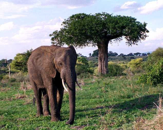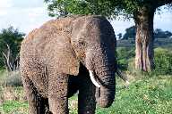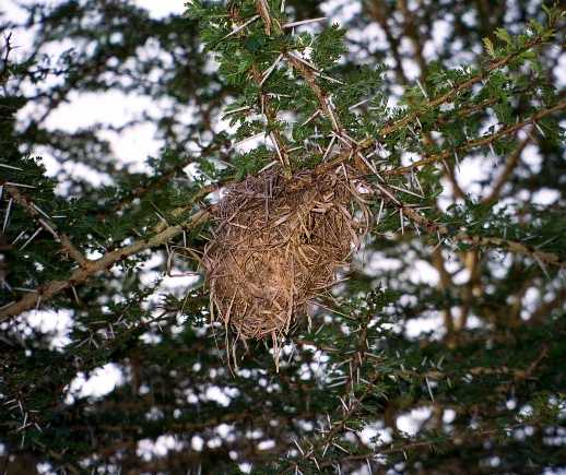 A bird's nest in a an acacia tree. Giraffes snarf these leaves down, their thick-skinned lips protecting them from the thorns. |